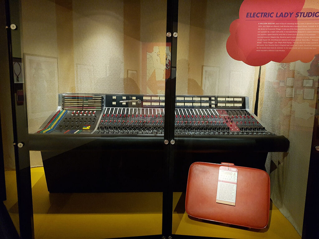 We lopen eerst een tentoonstelling van Jimi Hendrix in waar o.a. het mengpaneel uit de Electric Lady studio te zien is, een gitaar van Jimi Hendrix, zijn paspoort en een notitie boekje van ‘m. Heel leuk is dat ze het paspoort hebben gekopieerd op een soort vinyl en dat je door die versie kan bladeren terwijl je het echte exemplaar achter glas kan bekijken. Hetzelfde hebben ze ook met het notitieboekje gedaan.
