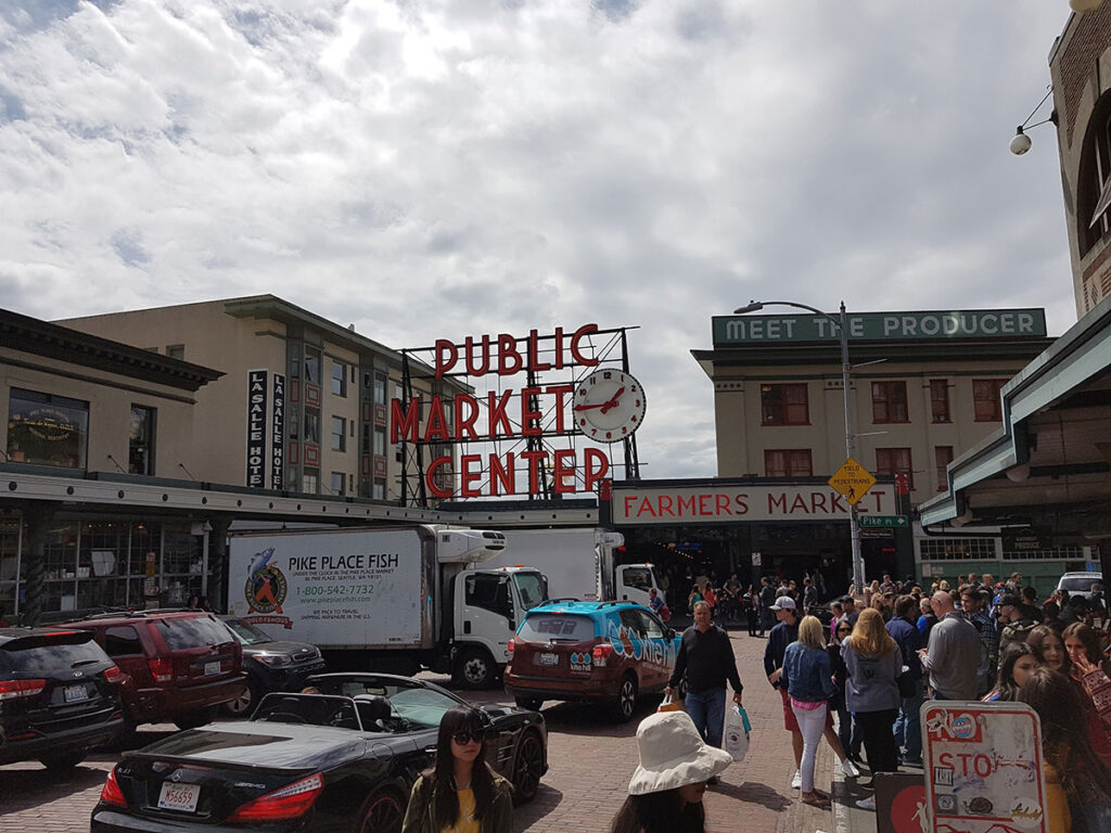 We besluiten naar Pike street te rijden en daar proberen te parkeren omdat alle reisgidsen zeggen dat je dit gedeelte van de stad gezien moet hebben. Dan gaan bij mij alle alarmbellen rinkelen omdat je meestal in een groot toeristisch gekkenhuis terecht komt. We lopen Pike Street af naar 1st Avenue en daar is de Public Market Center en daar is het echt een groot gekkenhuis zoals we al hadden kunnen verwachten. De market Place bestaat uit meerdere verdiepingen en de onderste verdieping is 10% zo druk als de bovenste verdieping en daar delen mijn reisgenote en ik bij een Chinees restaurant een kom soep die je bij de lunch krijgt (niet echt een knaller) maar de twee eggrolls en de rijst met zoutzure kip zijn geweldig en staan we na ongeveer 30 minuten weer 24 dollar lichter weer buiten.