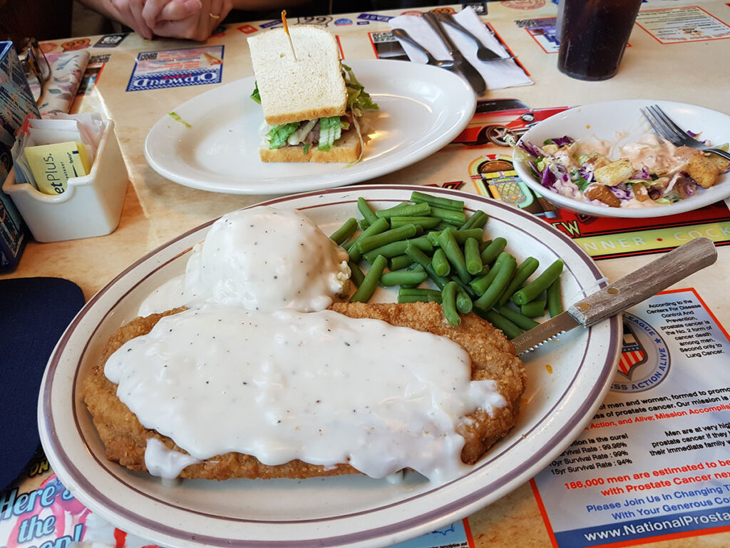 Een half uur later dan gepland komen we in de buurt van ons hotel en hebben geen zin meer om nu nog te gaan zoeken naar een restaurant en duiken de parkeerplaats van Dave’s Diner & Brew op. We lopen naar binnen en worden aan een tafel aan het raam gezet omdat de booths vol zijn. Geen probleem zo kunnen we naar het verkeer kijken. Mijn reisgenote bestelt een Sandwich Roasted Beef en ik ben zo dom om The Mother Load te bestellen vooral omdat ik erg benieuwd ben welke gerecht bij die naam hoort.