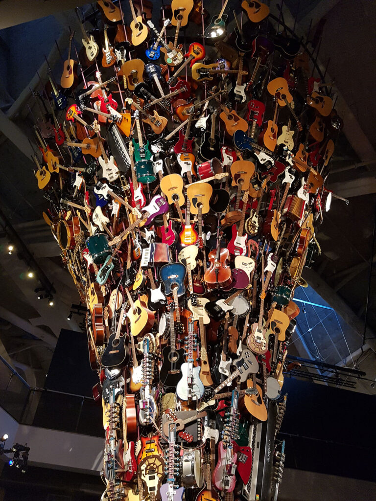 Nou gelukkig is dat niet moeilijk want wij vinden het museum helemaal geweldig. Als je binnenkomt is het eerste wat je ziet een enorme muziekinstrumenten tornado die 2 verdiepingen hoog is en een fantastisch grote videowall waar videoclips op gedraaid worden.