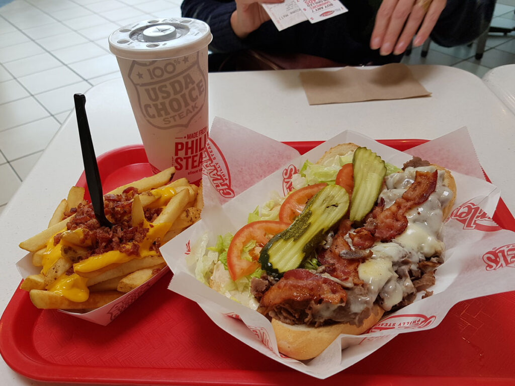 Ik had me nog zo voorgenomen aangezien ik al minstens 4 kilo ben aangekomen (als het er geen 9 zijn…) om wat gezonds te gaan eten maar als we bij de stand van de Charleys Philly Steaks een stukje mogen proeven ben ik al snel al mijn goede voornemens vergeten. We bestellen een regular Philly Cheese Steak met patat met daarover kaas en stukjes bacon die we samen delen. Op de Cheese steak zit ook sla, tomaat en een zurebom op dus eigenlijk best gezond (…).