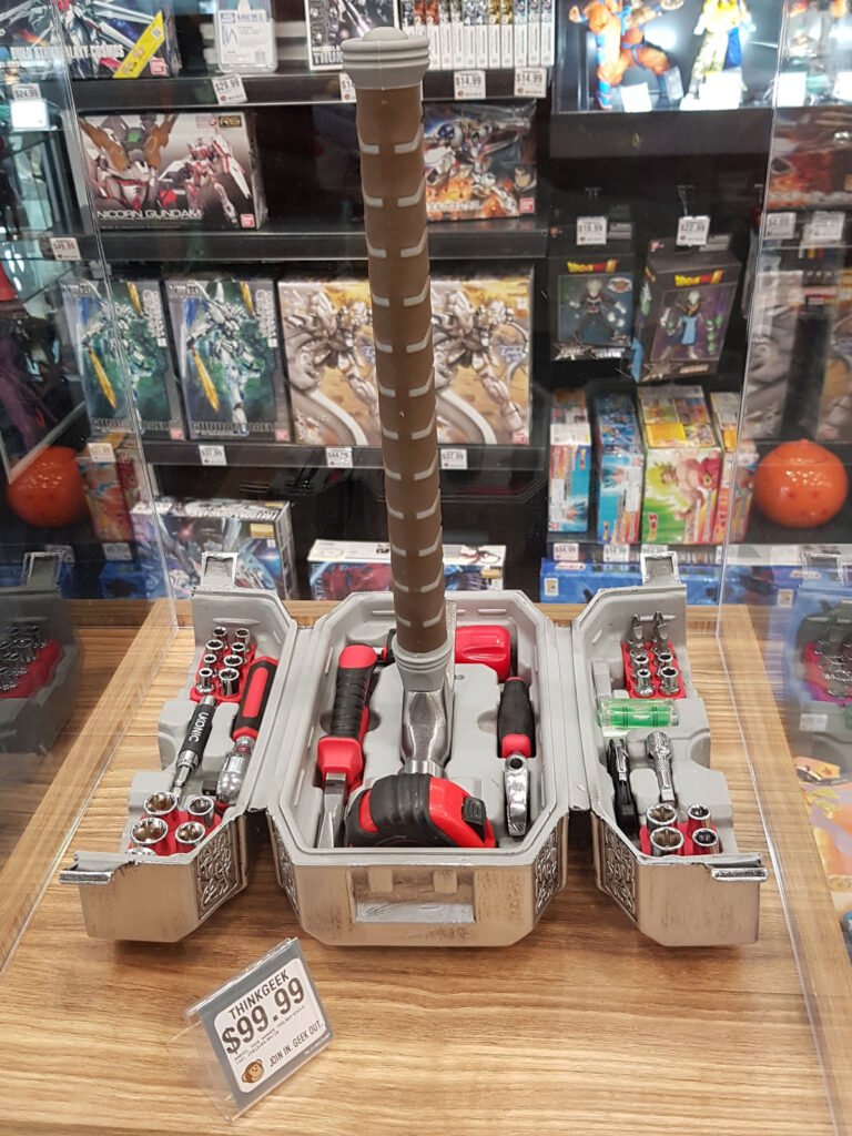 Daarna lopen we het winkelcentrum en komen bij een stenen winkel van de beroemde website ThinkGeek en zien een hele grappige gereedschapskist vermomd als de hamer van Thor. Kost wel even 99 dollar.