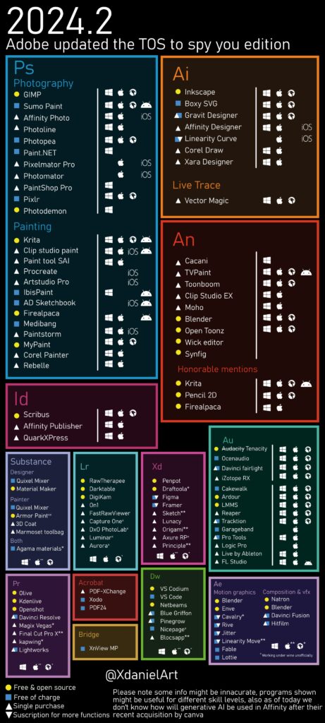 Maar om iedereen te helpen om van hun Adobe software af te komen heeft de geweldige xDanielArt een overzicht gemaakt hoe je het beste al de door jou gebruikte Adobe programma’s kan vervangen met gratis of voordeligere alternatieven. Helemaal onderaan de afbeelding staat de verklaring van al die symbooltjes die voor de software programma’s staan.