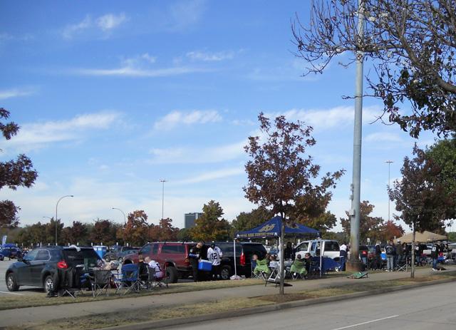 Rijdend richting het stadion kwamen we allemaal parkeerplekken tegen maar ik besloot gewoon naar het stadion te rijden. Aangekomen in de buurt van het stadion was er aan de rechterkant een enorme parkeerplaats en daar kostte het 40 dollar om je auto neer te zetten. De volgende parkeerplaats, nog dichter bij het stadion, kostte 60 dollar. Ik besluit weer terug te rijden naar de fabrieksterreintjes en sla links af richting het honkbal stadion van de Texas Rangers. Daar zijn ook twee enorme parkeerplaatsen en bij de laatste kost het parkeren maar 20 dollar. Voor 20 dollar (14,70 euro) kan je nog niet eens een middag parkeren in Rotterdam centrum dus we parkeren onze auto daar.