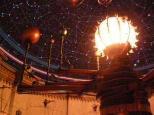 Na het eten lopen we terug naar de StormRider maar daar is de rij nog 70 minuten dus we besluiten richting uitgang te gaan. We lopen helemaal door de enorme vulkaan heen en komen in een soort van paleis/kasteel. Hier kun je alle kamers in en in elke kamer is wel iets te doen en alles in de stijl van Leonardo Da Vinci of het tijdperk waarin hij leefde. Het door hem ontworpen vliegtuig staat er maar ook is er een super mooi ouderwets planetarium dat je door aan hendels te draaien kan bedienen, je kan kanonnen afschieten en afstandbestuurbare zeilboten besturen maar dan helemaal oude in stijl.