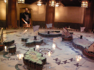 Na het eten lopen we terug naar de StormRider maar daar is de rij nog 70 minuten dus we besluiten richting uitgang te gaan. We lopen helemaal door de enorme vulkaan heen en komen in een soort van paleis/kasteel. Hier kun je alle kamers in en in elke kamer is wel iets te doen en alles in de stijl van Leonardo Da Vinci of het tijdperk waarin hij leefde. Het door hem ontworpen vliegtuig staat er maar ook is er een super mooi ouderwets planetarium dat je door aan hendels te draaien kan bedienen, je kan kanonnen afschieten en afstandbestuurbare zeilboten besturen maar dan helemaal oude in stijl.