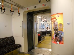 We lopen het restaurant uit en we willen nu naar DisneySea maar waar is dat? We lopen even een snel rondje door het kleine aangrenzende winkelcentrum, we kijken op een kaart maar nergens kunnen we iets van een entree vinden. We lopen een hal in en daar is weer een metro ingang, ook weer met gewoon de toegangspoortjes zoals we normaal gebruiken als we de metro instappen. Maar dit is een monorail speciaal en alleen voor vervoer tussen dit station, de twee parken en de bij Disney horende Hotel Resorts.